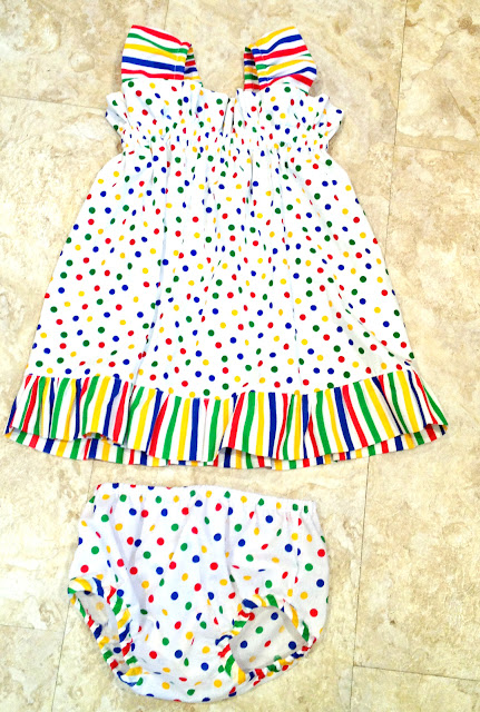 I first combined these  multi-coloured spot and stripes fabrics when making a little dress and knickers set for my first grand-daughter nearly two years ago. Unfortunately the dress didn't survive long enough to be photographed, I assume it got eaten by the washing machine. I managed to take a photo of the knickers before their demise, which you can see on this post